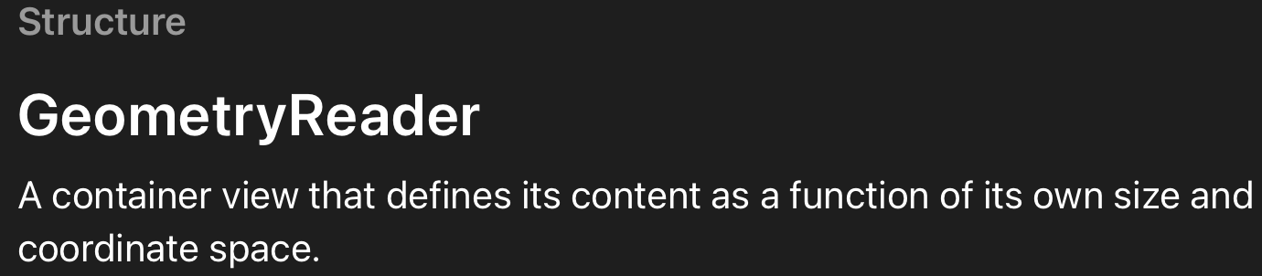 우선 GeometryReader가 도큐먼트에 쓰여있는 정의를 번역하자면, GeometryReader는 그 자체로 ‘View’이며, container 안 View 스스로의 크기와 위치를 함수로 정의한다고 소개되어있다.