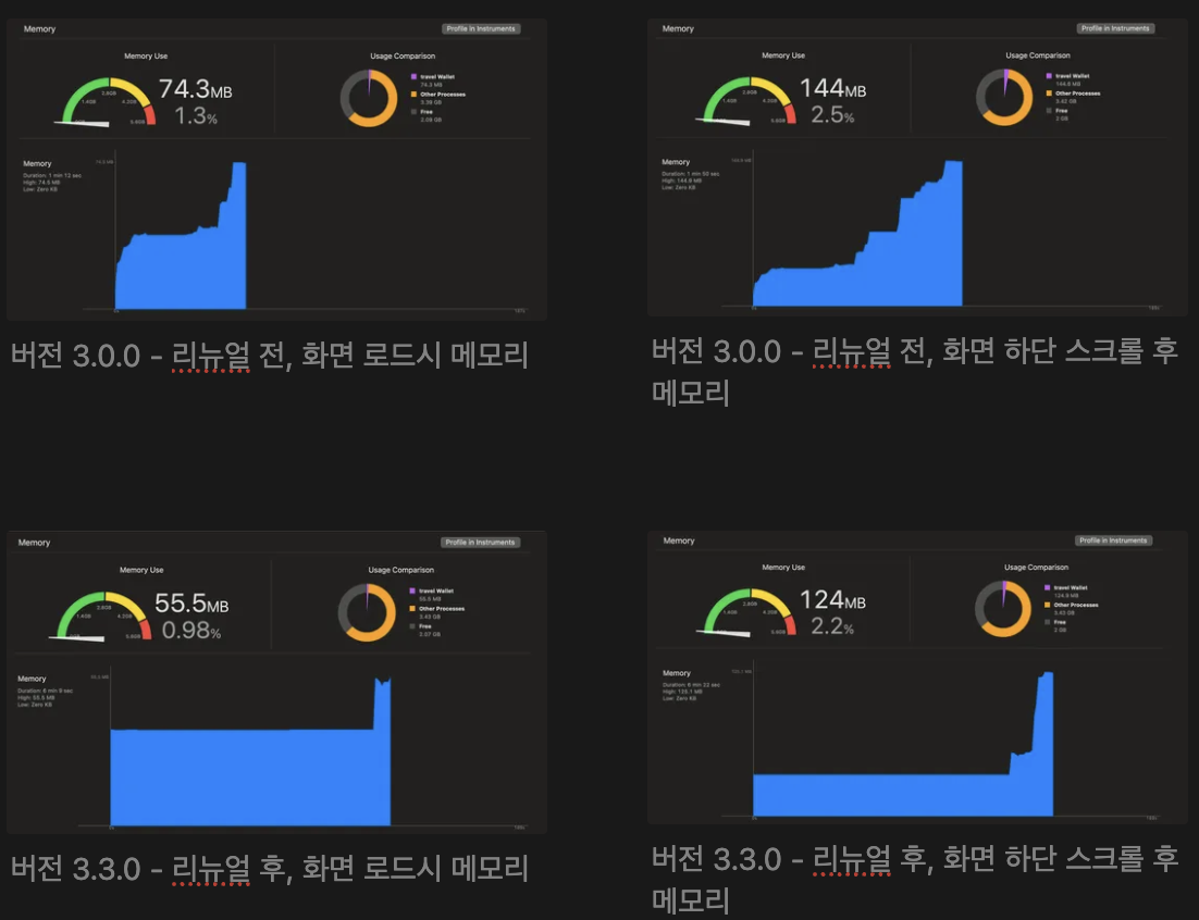 이번 혜택탭 개선을 변경한 뒤, 기존의 CollectionView안의 CollectionView가 중첩된 형태 였는데요. 이것을 걷어내면서, 메모리가 얼마나 개선되었는지 알아보기 위해서 버전 3.0.0과 3.3.0을 비교해 보았습니다.
