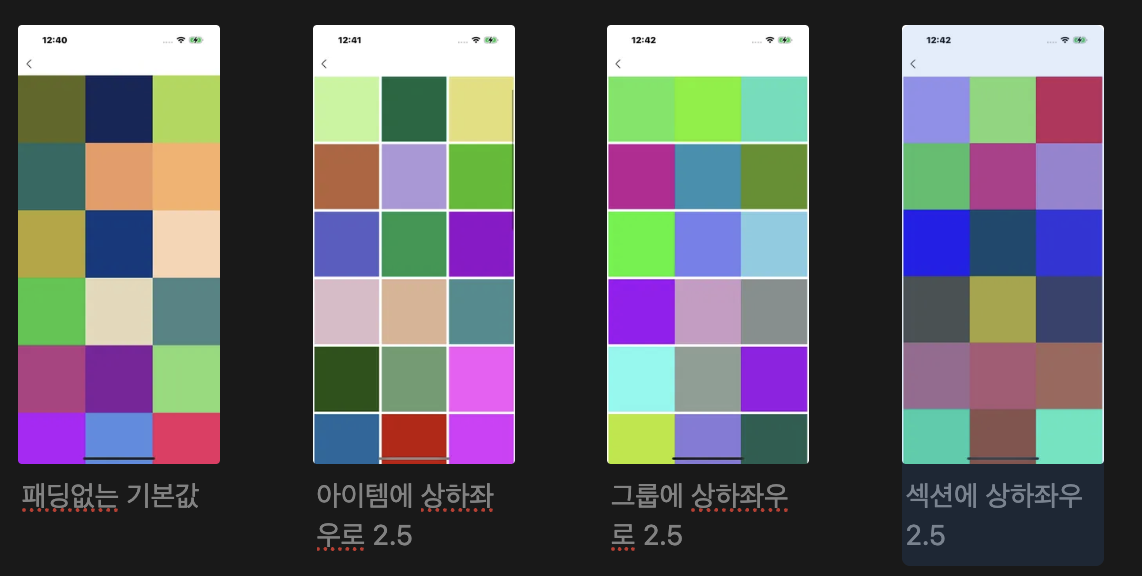 (각각의 섹션, 그룹, 아이템에는 NSDirectionalEdgeInsets()를 통해서 패딩을 줄 수 있다.)