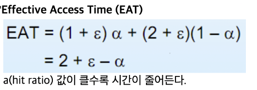 - TLB도달범위(TLB reach) : 모든항목이 체워졌을때 miss없이 접근할수 있는 메모리 접근 범위를 의미한다.