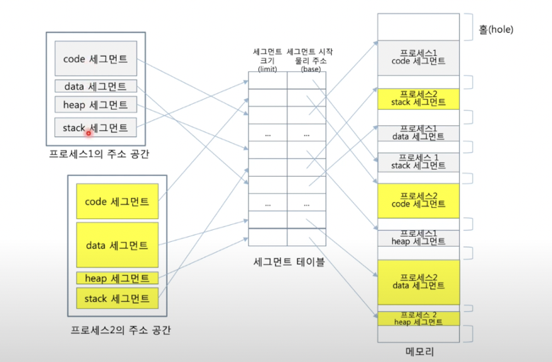 즉 세그멘테이션은 하나의 프로세스 메모리 공간에서 코드영역, 데이터영역, 힙, 스택을 나누고 그것의 크기를 확인하여 하나의 물리주소에 대입하는 것을 한다.