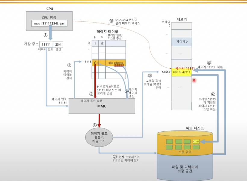 Cpu에서 현재 사용하고자 하는 프로세스의 가상주소를 통해서 페이지 테이블을 검색해서 현재 내가 접근하고자 하는 페이지의 물리주소를 알게 된다. 여기에서 현재 메모리상에 쓰고자 하는 프로세스가 올라가 있는지 확인을 하게 되고 그렇지 않으면 페이지폴트가 발생한다.(trap) 이후 페이지 폴트 커널 코드를 통해서 현재 페이지폴트가 사용해야 하는 물리주소에 있는 프로세스를 스왑영역에 스왑아웃 시키고, 사용하고자 하는 페이지를 스왑인 시켜주는 것으로 실행시키며, 마무리 작업으로 페이지 테이블을 갱신하고 물리주소를 가져오는것으로 실행한다.