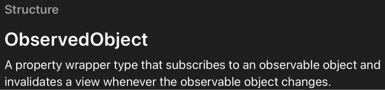 즉, ObservedObject로 레핑한 인스턴스는, ObservableObject로 선언된, ViewModel을 계속해서 관찰하고 있으며 해당 뷰 모델값이 변경될때, View를 리프레시 해준다.
