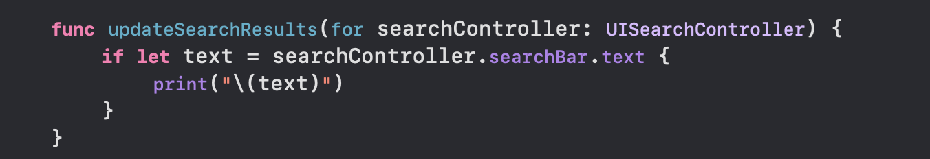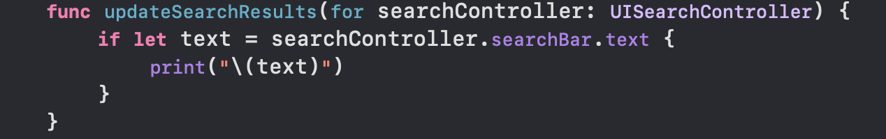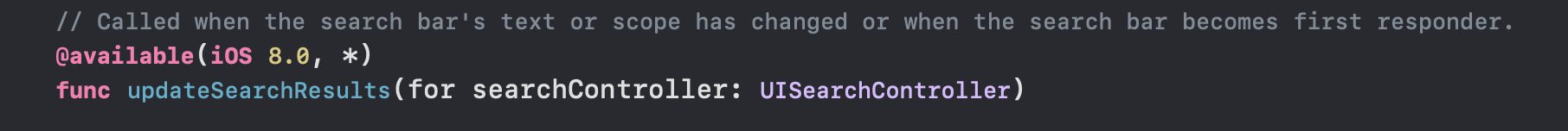 해당 프로토콜을 채택하면 안에 있는 updateSearchResults 메소드를 구현해야하는데, 이 함수는 searchbar에 입력이 들어오면 실행되는 함수이다.