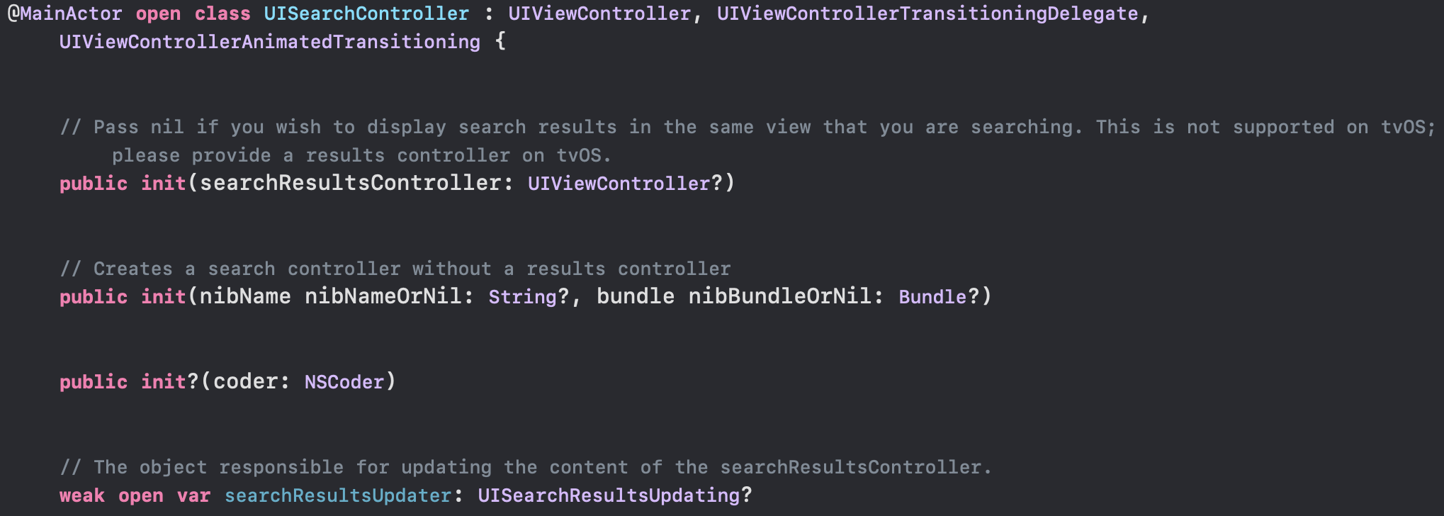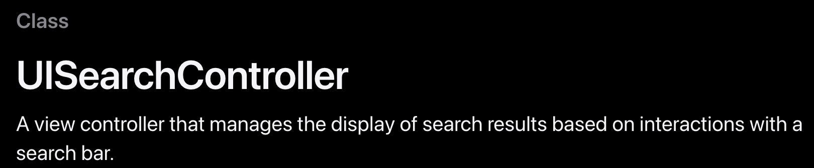 UISearchController는 새로운 뷰 컨트롤러에 검색 결과를 보여주는 상호작용을 할때 사용하는 컨트롤러이다.